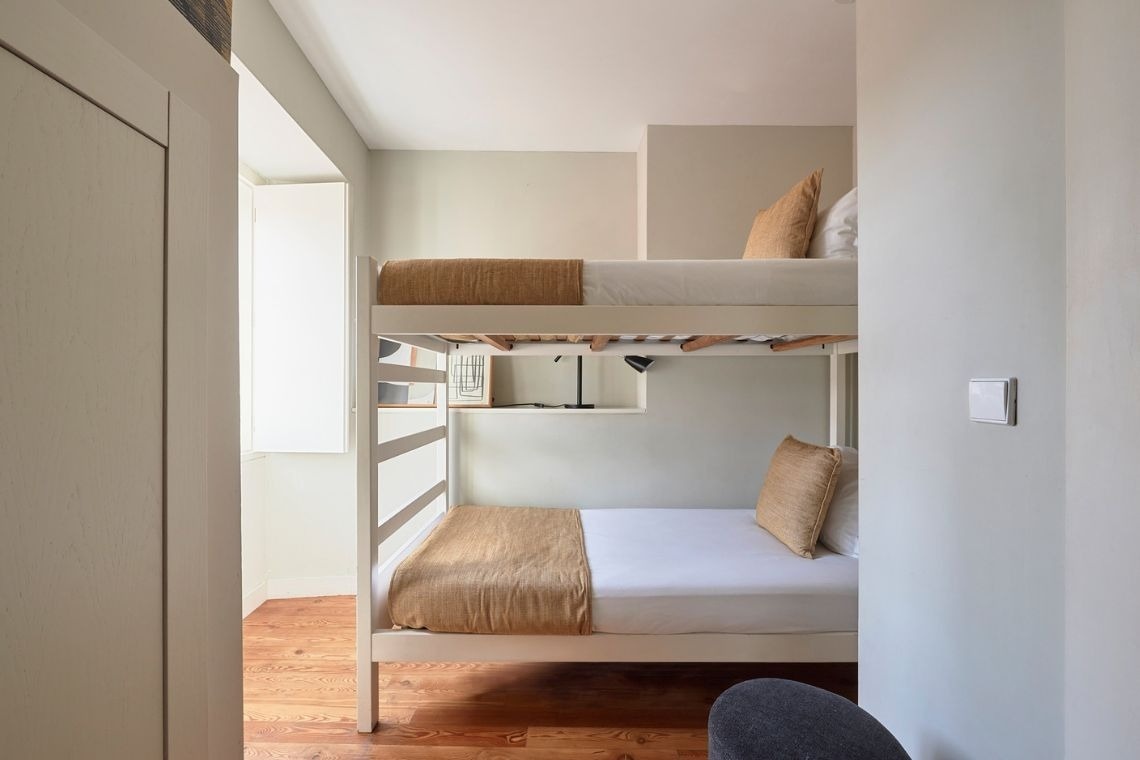 Apartamento Remédios no terceiro piso, composto por dois quartos, o principal com cama de casal e o segundo com beliche. Com design sofisticado e confortável, dispõe de todos os equipamentos essenciais para uma estadia fácil e prática, incluindo ar-condicionado, máquina de lavar a roupa e máquina de café. A entrada no apartamento é feita com chave física.